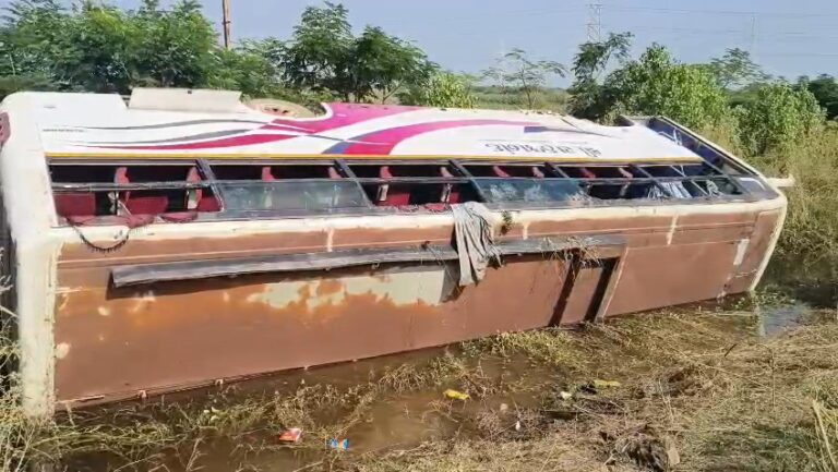 (તસ્વીરઃ વિરલ રાણા, ભરૂચ) વાગરાથી જાનૈયાઓને લઈને ભરૂચ તરફ જઈ રહેલી એક ખાનગી લક્ઝરી બસ ખાન તળાવ નજીક પલ્ટી જતાં...
