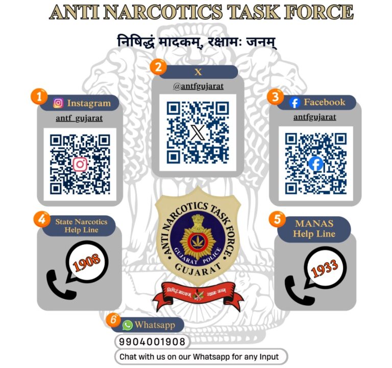 હવે કોઈ પણ નાગરિક ડ્રગ્સ સંબંધિત માહિતી આપવા માટે ANTF ગુજરાત વોટ્સએપ નંબર: 99040 01908 ઉપર સંપર્ક કરી શકશે નાગરિકો નાર્કોટિક્સ હેલ્પલાઇન નંબર 1908 ઉપર...