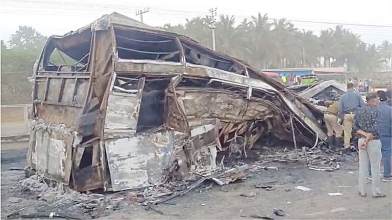 ટક્કર બાદ બસમાં વિસ્ફોટ થયો અને તે આગમાં ઘેરાઈ ગઈ. બસમાં કુલ ૩૨ મુસાફરો હતા. ચિત્તદુર્ગ, કર્ણાટકના ચિત્રદુર્ગ જિલ્લાના હિરિયુર...