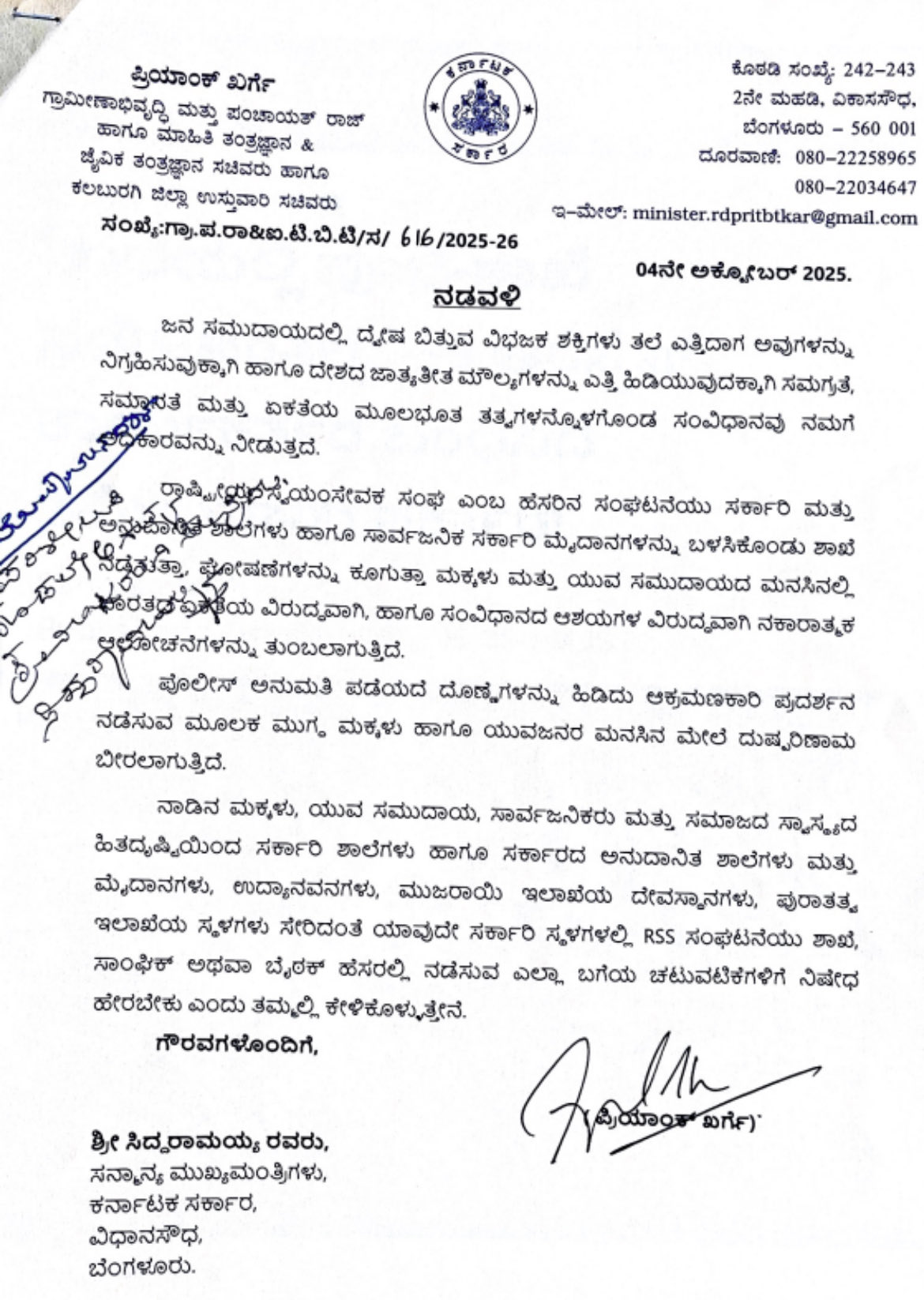 પ્રિયંક ખડગે પત્રમાં આરએસએસની શાખાઓ અને સભાઓ તેમજ તેના જાહેર કાર્યક્રમો પર પ્રતિબંધ મૂકવાની માંગ કરી છે.
