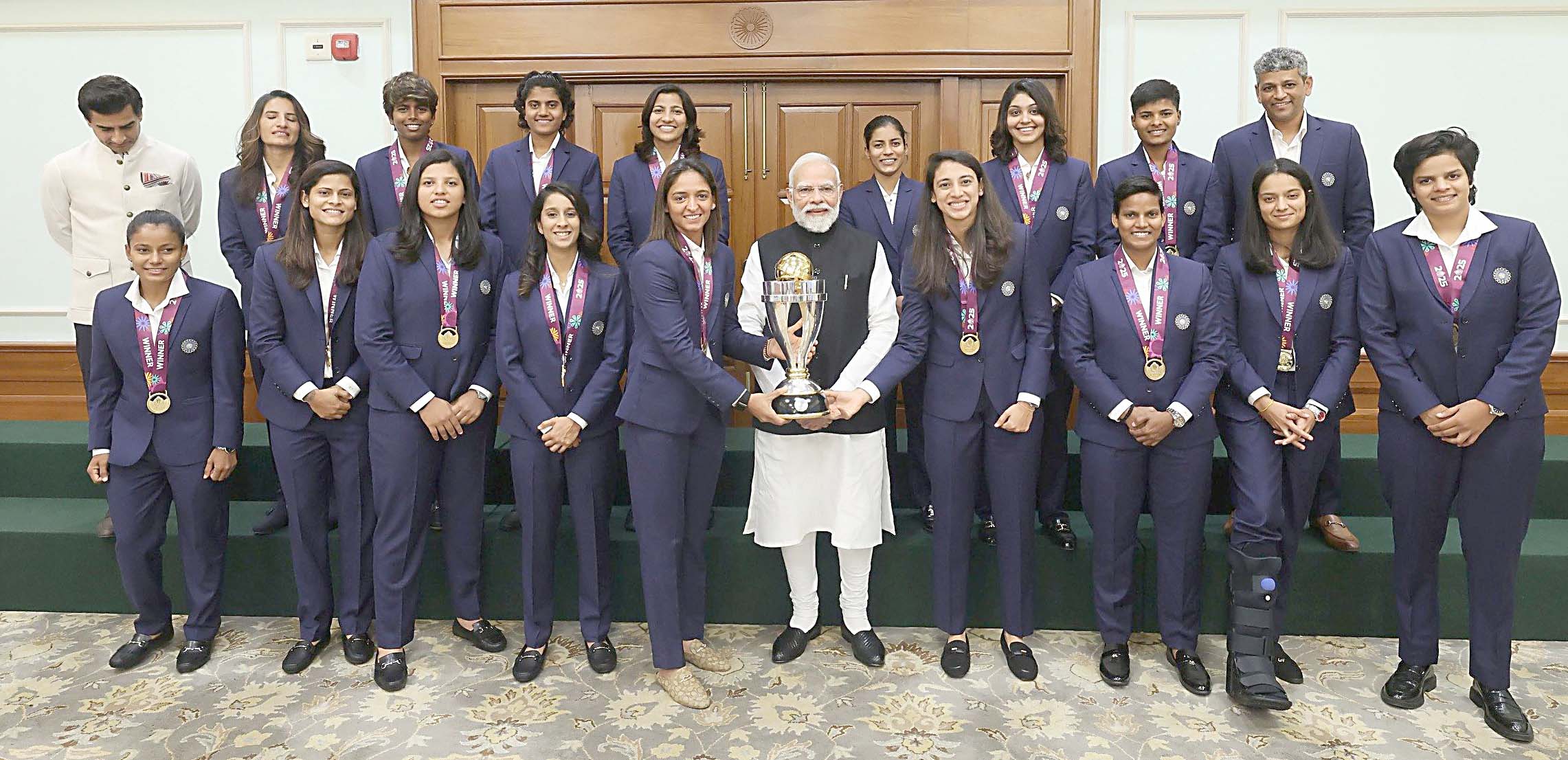 નવી દિલ્હી, વડા પ્રધાન નરેન્દ્ર મોદીએ બુધવારે અહીં લોક કલ્યાણ માર્ગ સ્થિત તેમના સત્તાવાર નિવાસસ્થાને મહિલા ક્રિકેટ ટીમને તેમની ઐતિહાસિક વન-ડે વર્લ્ડ કપ જીત બદલ મળ્યા હતા.