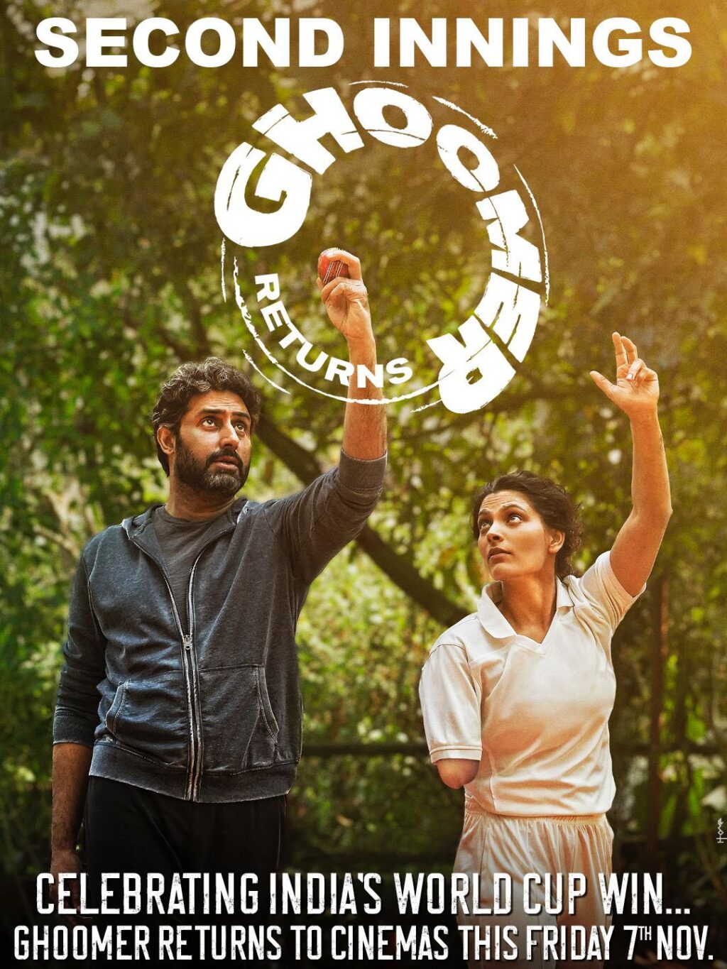 મુંબઈ, હજુ પણ ભારત દેશ ઇન્ડિયન ક્રિકેટ ટીમની વર્લ્ડ કપ જીતની ખુશી મનાવી રહ્યો છે, ત્યારે હવે ક્રિકેટનો જુસ્સો અને તેનાથી અનેકને પ્રેરણા આપતી ફિલ્મ ઘૂમર મોટા પડદે પાછી ફરી રહી છે. આર બાલકીની આ વખણાયેલી ફિલ્મ વર્લ્ડકપની જીતના માનમાં ફરી આવશે. અભિષેક બચ્ચન અને સૈય્યમી ખેરની આ ફિલ્મ દેશના ક્રિકેટ પ્રેમ અને તેને નવી વ્યખ્યા આપનાર મહિલા ટીમના માનમાં શુક્રવાર, ૭ નવેમ્બરે કેટલાંક થિએટરમાં ફરી રિલીઝ કરવામાં આવશે. અભિષેક અને સૈય્યામીની આ ફિલ્મ ‘ઘૂમ્મર’ ૧૮ ઓગસ્ટ, ૨૦૨૩ના દિવસે રિલીઝ થઈ હતી.