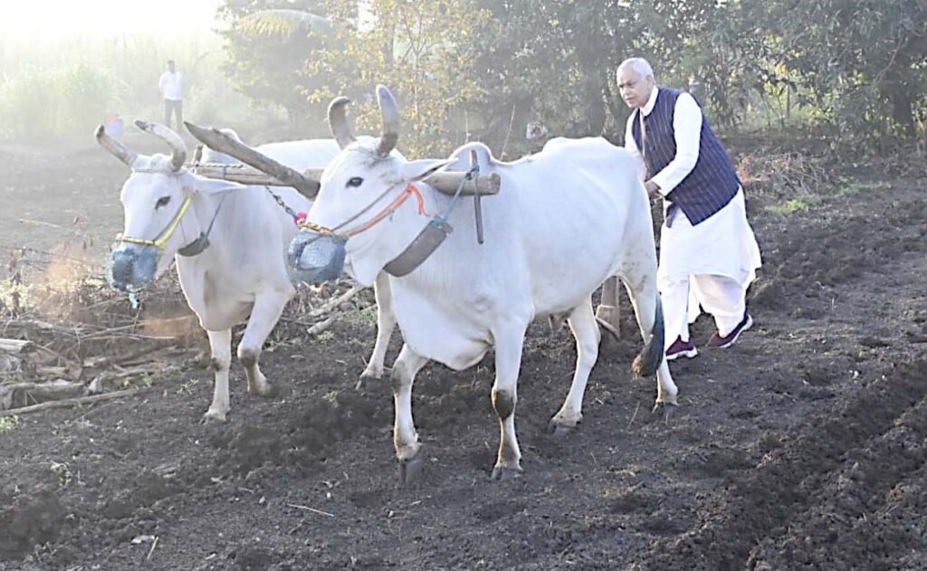 રાજ્યપાલે પ્રાકૃતિક કૃષિ કરતા ખેડૂતના ખેતર પર હળ ચલાવ્યું: વૃક્ષારોપણ કર્યું: ગાય દોહી