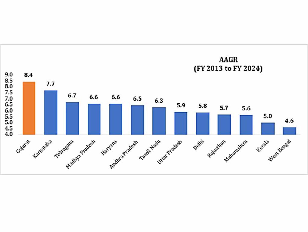 ઉલ્લેખનીય છે કે, વૃદ્ધિને સચોટ રીતે સમજવા માટે લાંબા ગાળાના પ્રદર્શનને વાસ્તવિક દ્રષ્ટિએ એટલે કે કોન્સ્ટન્ટ પ્રાઇસિસ પર માપવામાં આવે છે. આ ફુગાવાની અસરને દૂર કરે છે અને ઉત્પાદન અને આર્થિક પ્રવૃત્તિમાં વાસ્તવિક વધારો દર્શાવે છે. તેના આધારે, 2012-13થી 2023-24ના સમયગાળા દરમ્યાન ગુજરાતે સરેરાશ 8.42% વૃદ્ધિ દર હાંસલ કર્યો છે, જે ₹10 લાખ કરોડથી વધુની અર્થવ્યવસ્થા ધરાવતા તમામ મુખ્ય રાજ્યોમાં સૌથી વધુ છે.