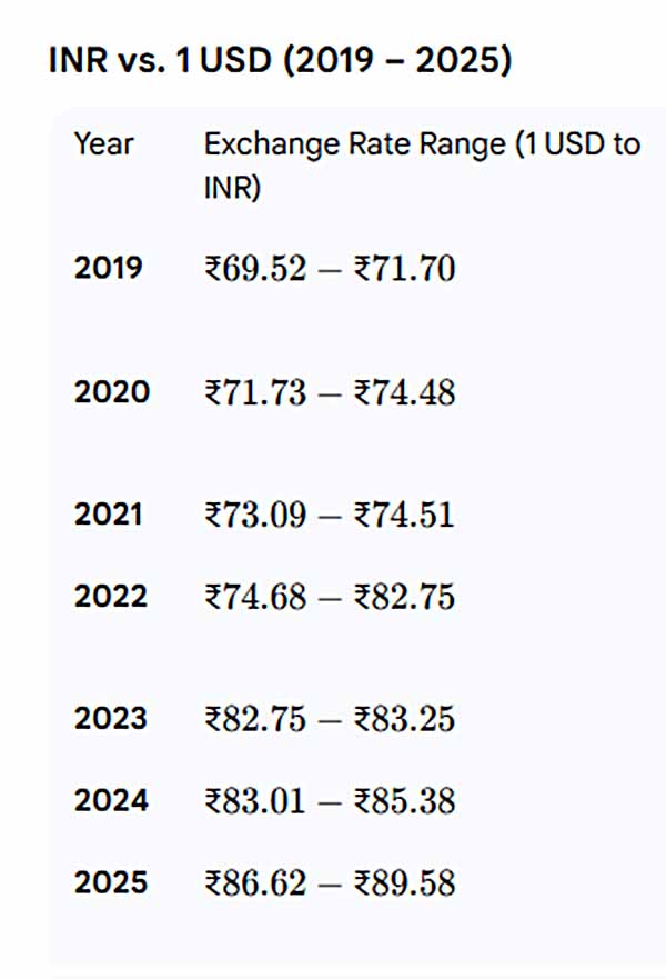 એટલે કે 50 થી 65 હજાર ડોલર એક વર્ષ માટે વિદ્યાર્થીઓ પાછળ ખર્ચ થાય છે. જે હવે 2025 માં 90 થી વધી ગયો છે.  ૨૦૨૫માં ડોલર સામે રૂપિયાની વેલ્‍યૂમાં છ ટકા જેટલો ઘટાડો થયો છે, ઈન્‍ડિયન કરન્‍સીને વધુ તૂટતી બચાવવા માટે RBIએ બુધવારે ડોલર્સ વેચ્‍યા હતા પરંતુ એક્‍સપર્ટ્‍સનું માનવું છે કે જ્‍યાં સુધી ઈન્‍ડિયા-અમેરિકા વચ્‍ચે ટ્રેડ ડીલ ફાઈનલ નહીં થાય ત્‍યાં સુધી રૂપિયામાં સુધારો થવાની શક્‍યતા ખૂબ જ ઓછી છે.