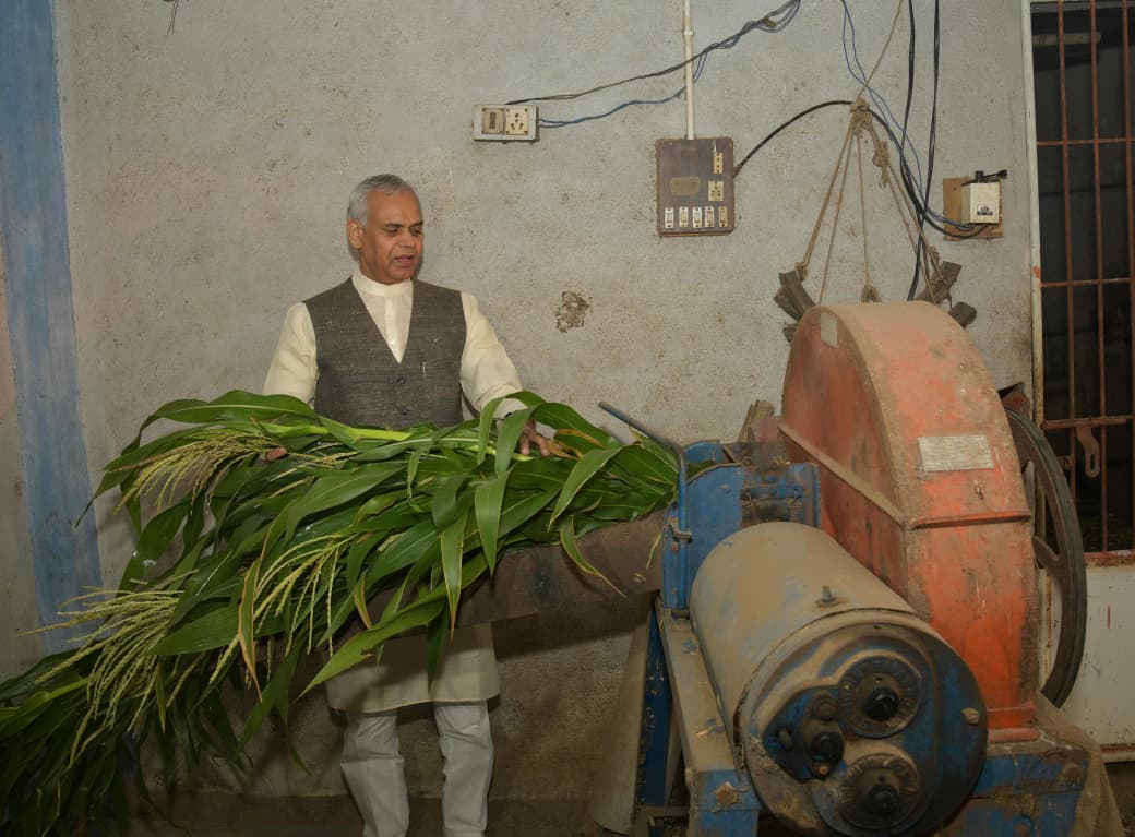 ખેતી, ગાય અને ગ્રામ્ય સંસ્કૃતિનું મહત્વ સમજાવતા રાજ્યપાલશ્રી આજે વહેલી સવારે ગામના પ્રાકૃતિક ખેતી કરતા ખેડૂત શ્રી પંકજભાઈ મારકણાના ખેતર પર પહોંચ્યા હતા. અહીં તેમણે બળદ ગાડું ચલાવ્યું હતું. બાદમાં ખેતરમાં જાતે જ મકાઈની કાપણી કરીને ગાય માટે ચારો તૈયાર કર્યો હતો.