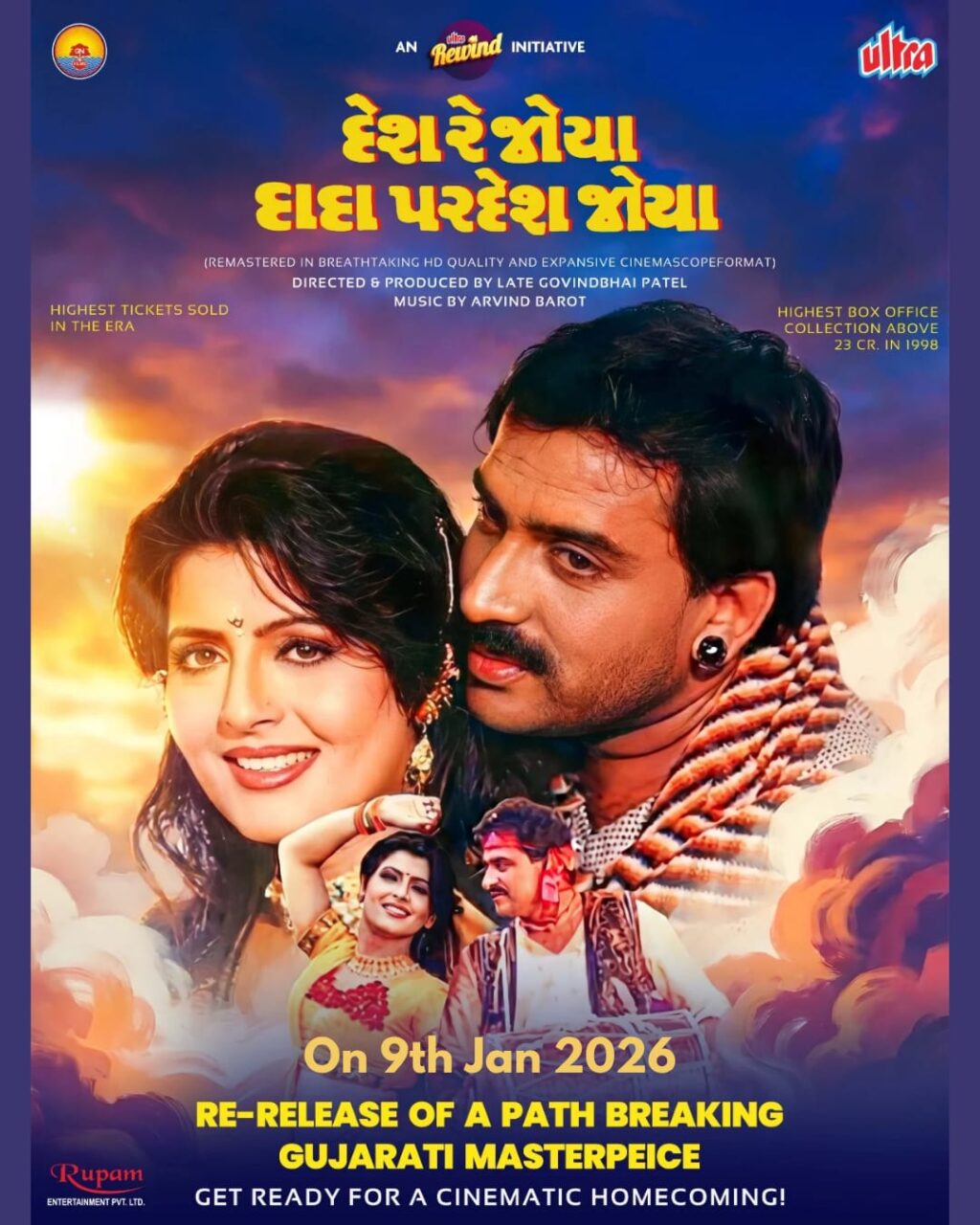 અમદાવાદ, 9 જાન્યુઆરી 2026થી ફરી સિનેમાઘરોમાં ગુંજશે દેશ રે જોયા દાદા પરદેશ જોયા — એક અમર ગુજરાતી સિનેમા ફરી મોટા પડદા પર કેટલીક ફિલ્મો માત્ર જોવાય છે. કેટલીક ફિલ્મો ઇતિહાસ રચે છે.અને કેટલીક ફિલ્મો પેઢીઓ સુધી જીવંત રહેનારી લાગણી બની જાય છે.