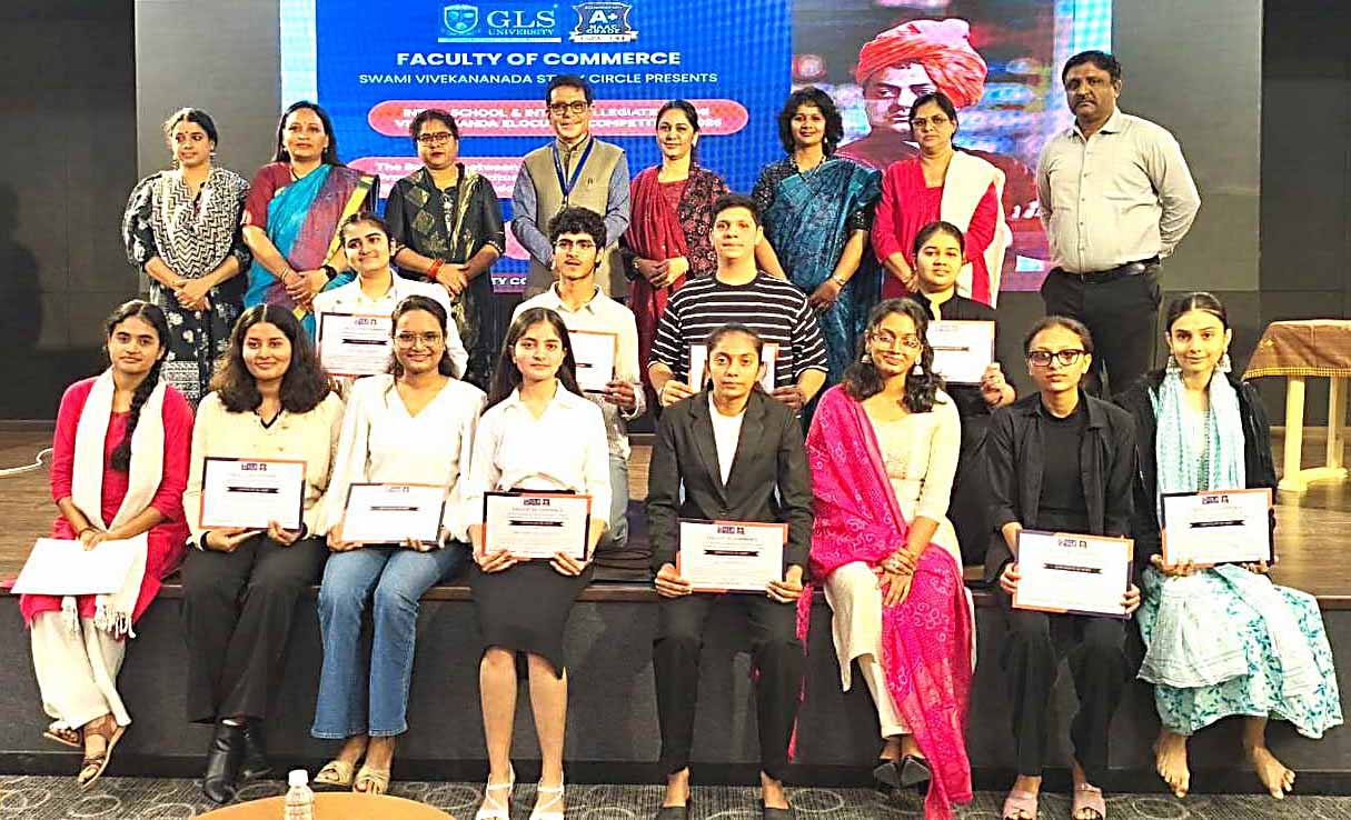 The event concluded on a grand and inspiring note, truly upholding the spirit of Universal Brotherhood and Swami Vivekananda’s vision of a strong, enlightened India, while reaffirming GLS University’s unwavering commitment to nurturing confident communicators and socially responsible citizens.