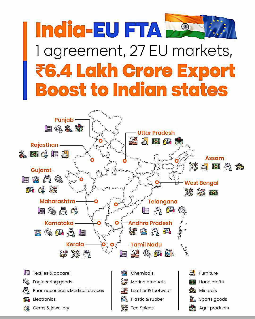 ભારતની નિકાસ પરના 97 ટકા ટેરિફ (જકાત) દૂર કરીને, આ સોદો ભારતીય ઉત્પાદન ક્ષેત્ર—ખાસ કરીને કાપડ, રત્ન-ઝવેરાત અને ચામડાના ઉદ્યોગને મોટો વેગ આપશે. બીજી તરફ, તે યુરોપિયન કાર અને મશીનરી માટે ભારતીય બજારના દરવાજા ખોલશે.