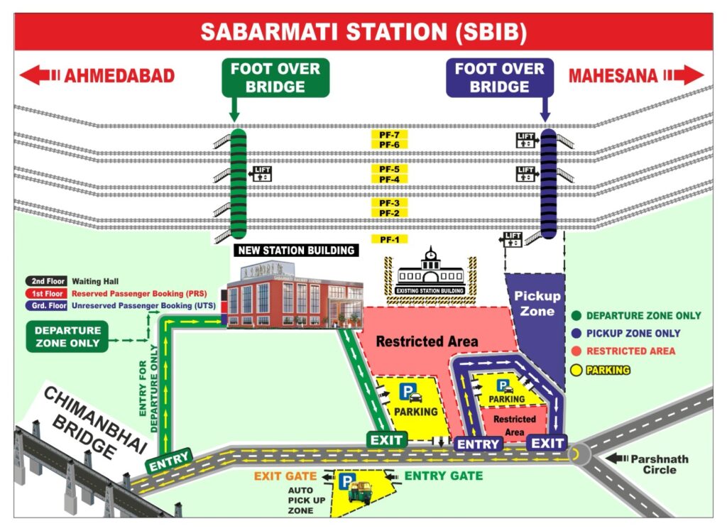 • પ્રવેશ દ્વાર: યાત્રીઓના વાહનોનો પ્રવેશ એમએમટીએસ બિલ્ડિંગ (બુલેટ ટ્રેન સ્ટેશન) નજીકથી કરવામાં આવી રહ્યો છે. (ડાયગ્રામમાં દર્શાવેલી ગ્રીન લાઇન મુજબ)