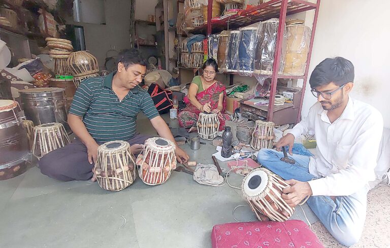 ગરબે ઘૂમતી વખતે ખેલૈયાઓ તાલ અને રીધમ સાથે બરાબર ઘૂમી શકે તે માટે તબલાં, ઢોલકને સરખાં કરવામાં આવી રહ્યા છે....